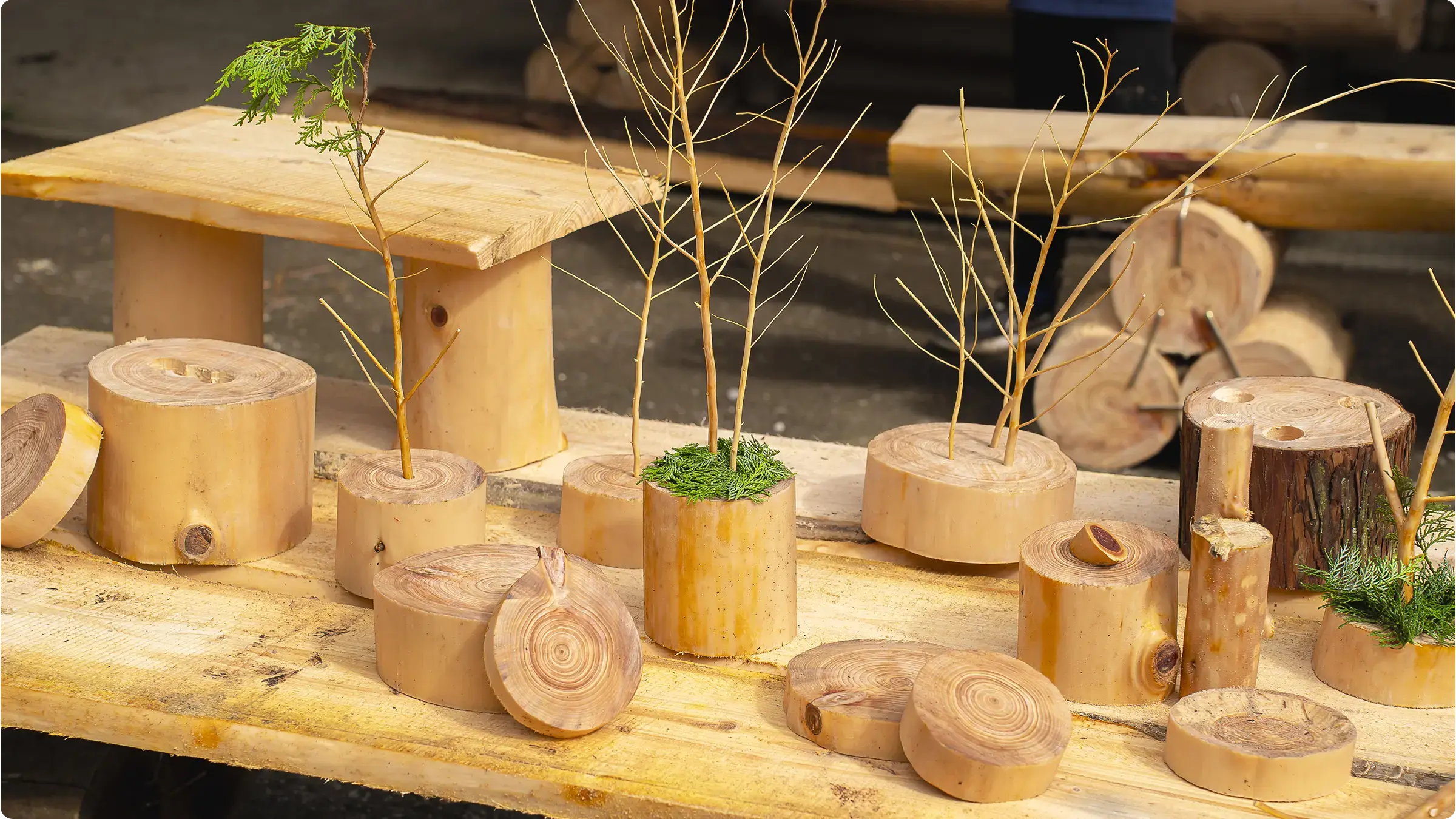 締めくくりは、2時間30分ほどかけて出来上がったたくさんのアイテムのお披露目会。丸太に穴を開けて仕上げた靴べら立て、丸太にヒノキの枝を刺した小物かけやオブジェ、鍋敷、テーブル、ティーライトキャンドルホルダーなどの作品がずらりと並び、最後は参加者全員で記念撮影をして終了しました。