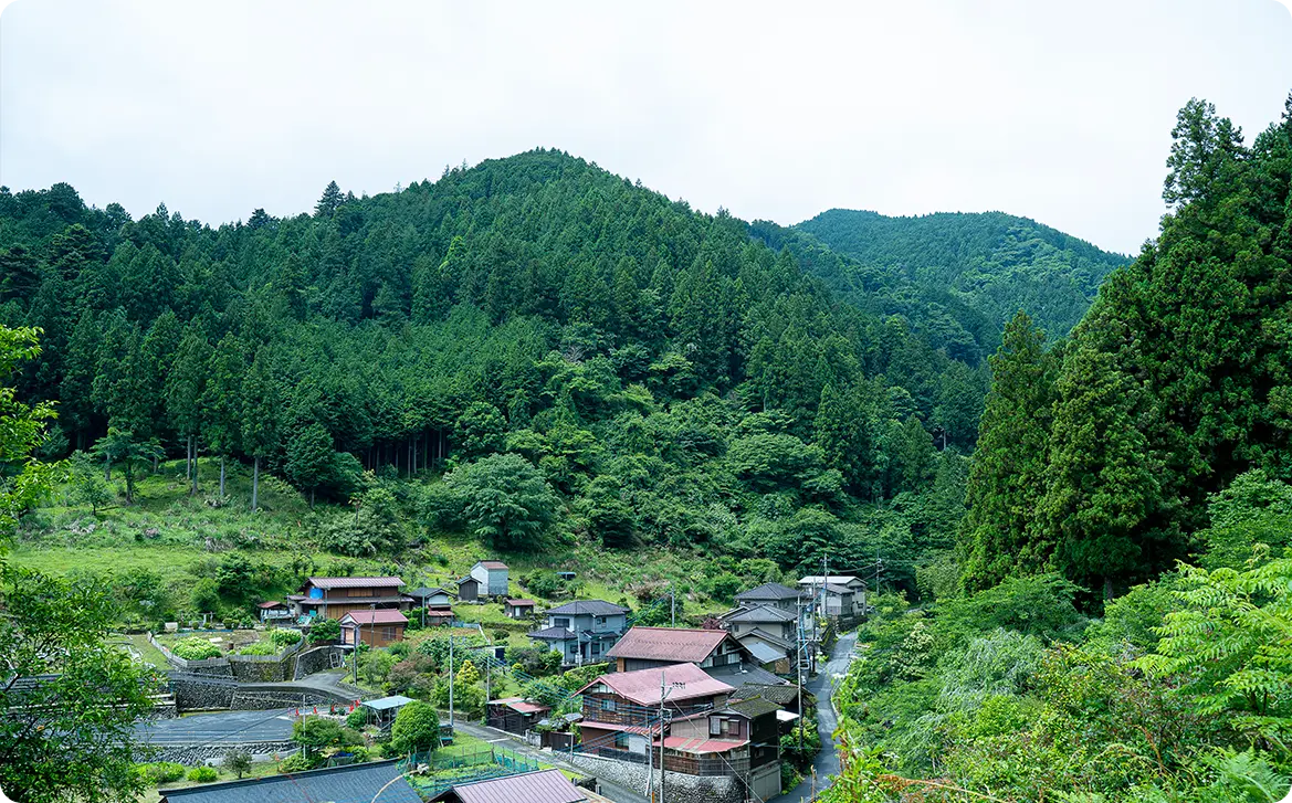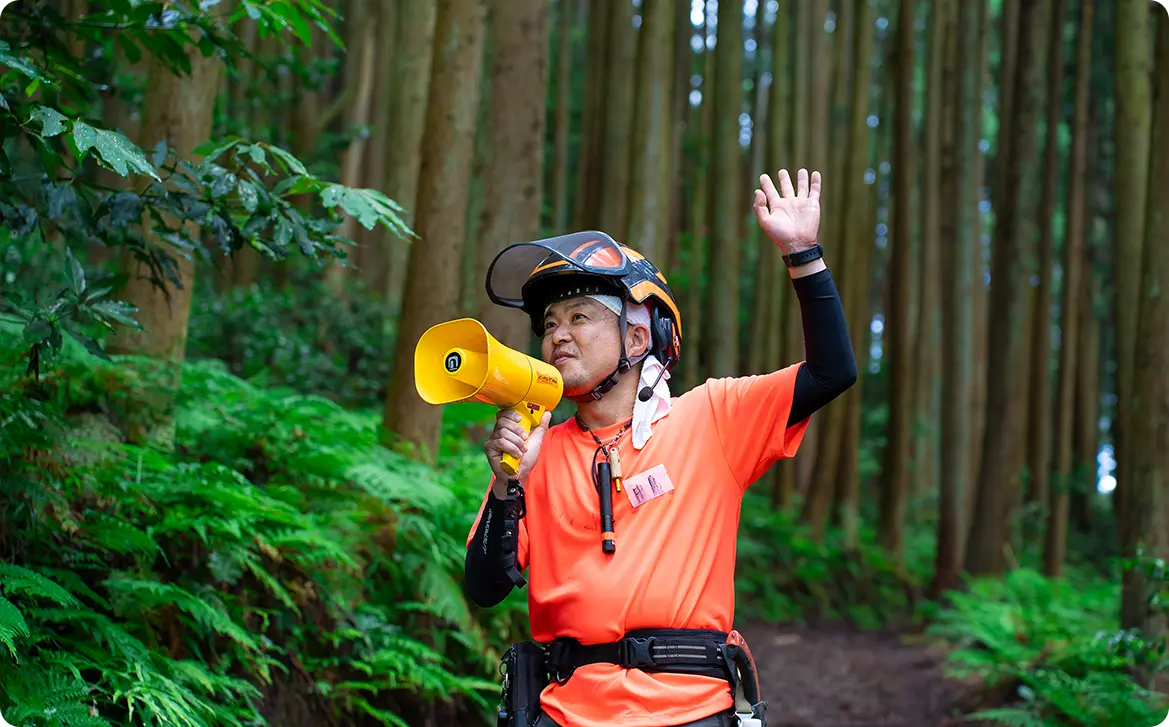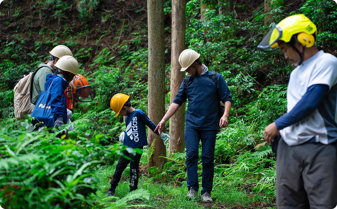 作業場から体験場所までは、30分ほどの山登り。時折、日が差すほど天候が回復し、歩き慣れない急な斜面が体力を奪いますが、ガイドスタッフの手厚いサポートのもと、それぞれのペースで歩を進めます。