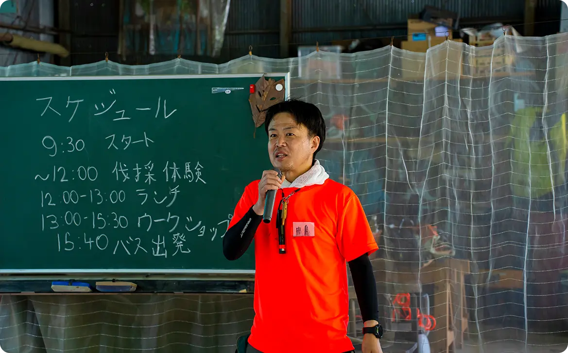 作業場では、ガイドを担当する中島林業代表の中島大輔さんが、1日をともに過ごすスタッフの紹介と体験の流れを説明しました。説明が終わる頃には心配されていた雨も上がり、出発の準備を整えて、いよいよ体験のスタートです。
