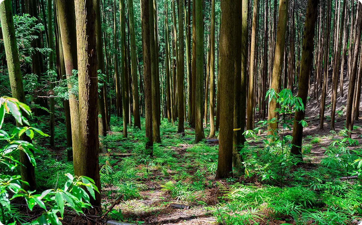 参加者が立っている両脇には、同じ年代に植えられたため同じくらいの高さ、太さに育ったヒノキが並んで生えています。