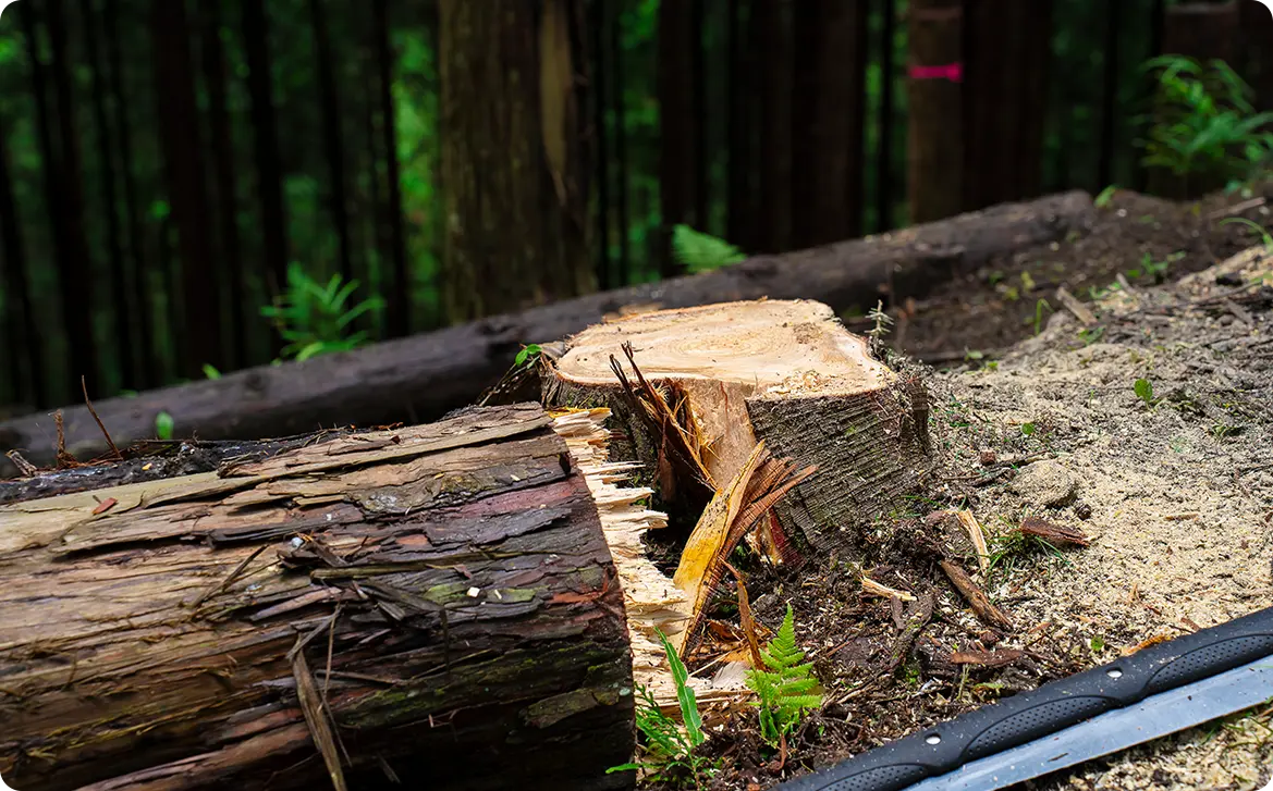 ノコギリを使って木の根本に「受け口」「追い口」を入れていきます。