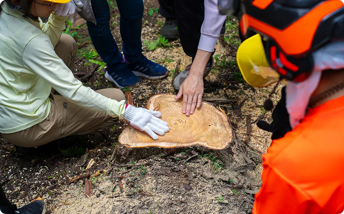伐倒したのはヒノキで全長19m、直径は一番太いところで20cmほど。林業のプロの手を借りて、枝払いをしたのちに1.8mの丸太にします。その間、参加者は木の年輪を数えて樹齢60年ほどであることを知ったり、切り株のヒノキの香りを楽しんだりしていました。