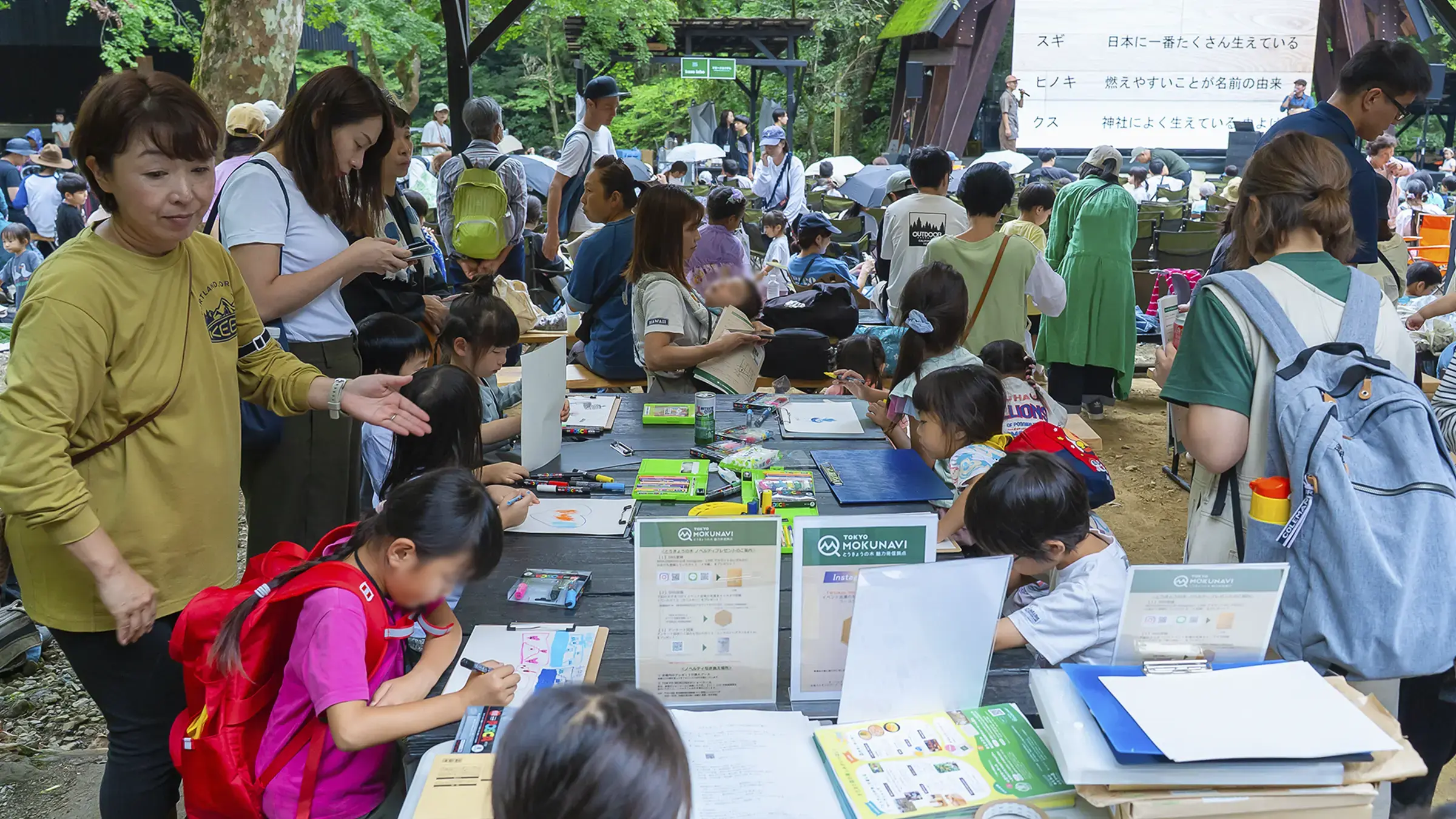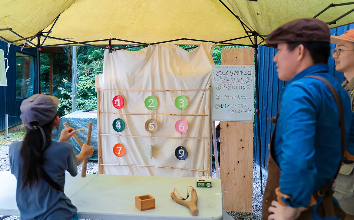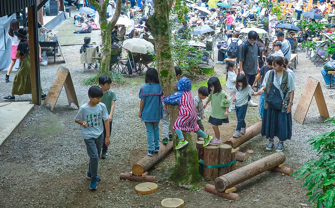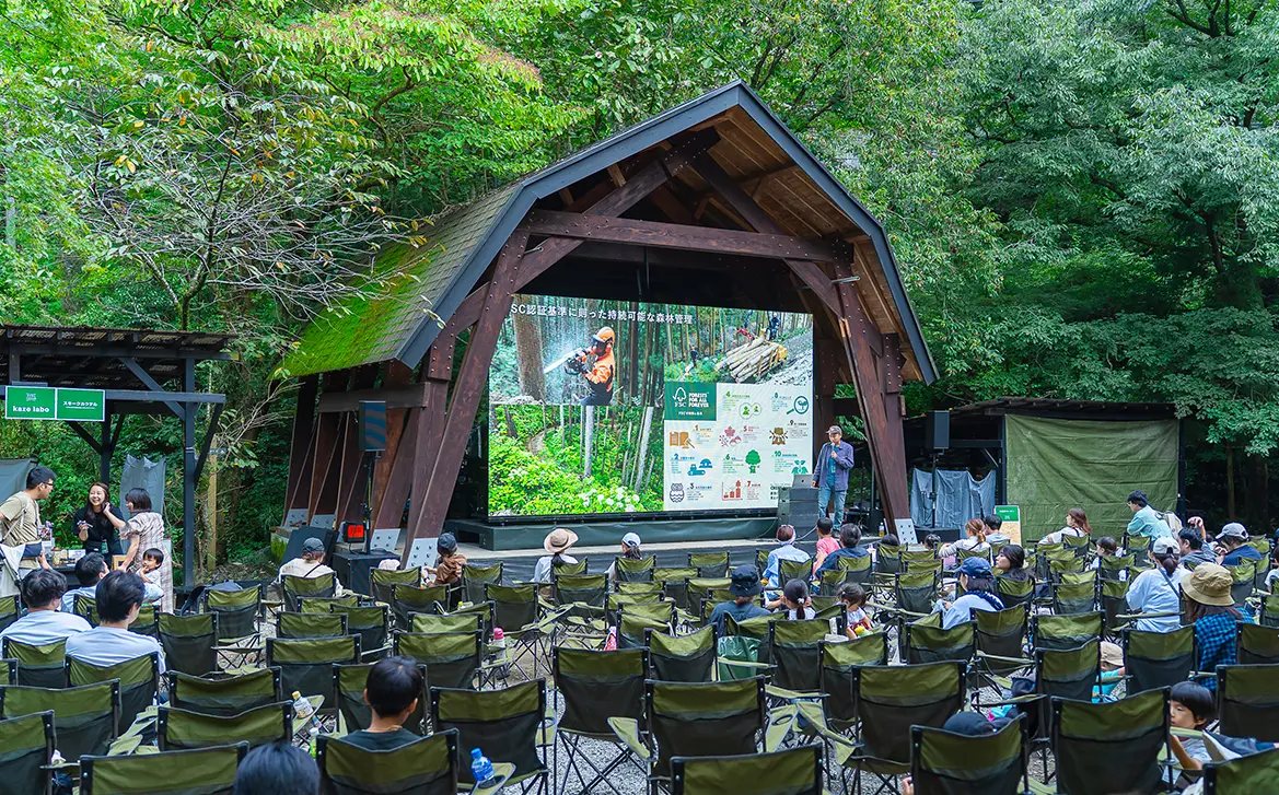 皆さんのお目当ては、やはり、青空の下での映画鑑賞。「木々に囲まれた中で映画を観るのは初めて」「子どもに貴重な体験をさせてあげたくて」などの声が来場者から多く聞かれ、ステージ上に設置した幅5.4m、高さ3mの巨大スクリーンの前に並べられたキャンプチェアはあっという間に満席になりました。「丸太アスレチック」や「薪割り」「バードコールづくり」「どんぐりパチンコ」など、とうきょうの木に触れられる体験型ワークショップはお子さま連れのファミリーに人気で、行列ができるほどの盛況ぶりとなりました。また、地元の食材を使った奥多摩産ヤマメのラーメン、東京しゃもパエリア、お好み焼きといったキッチンカーや、地元名物のあじさい茶のほか、スモークカクテルなどのドリンクも大好評。映画、食事、ワークショップ体験と、思い思いのスタイルで、森での1日を楽しんでいました。