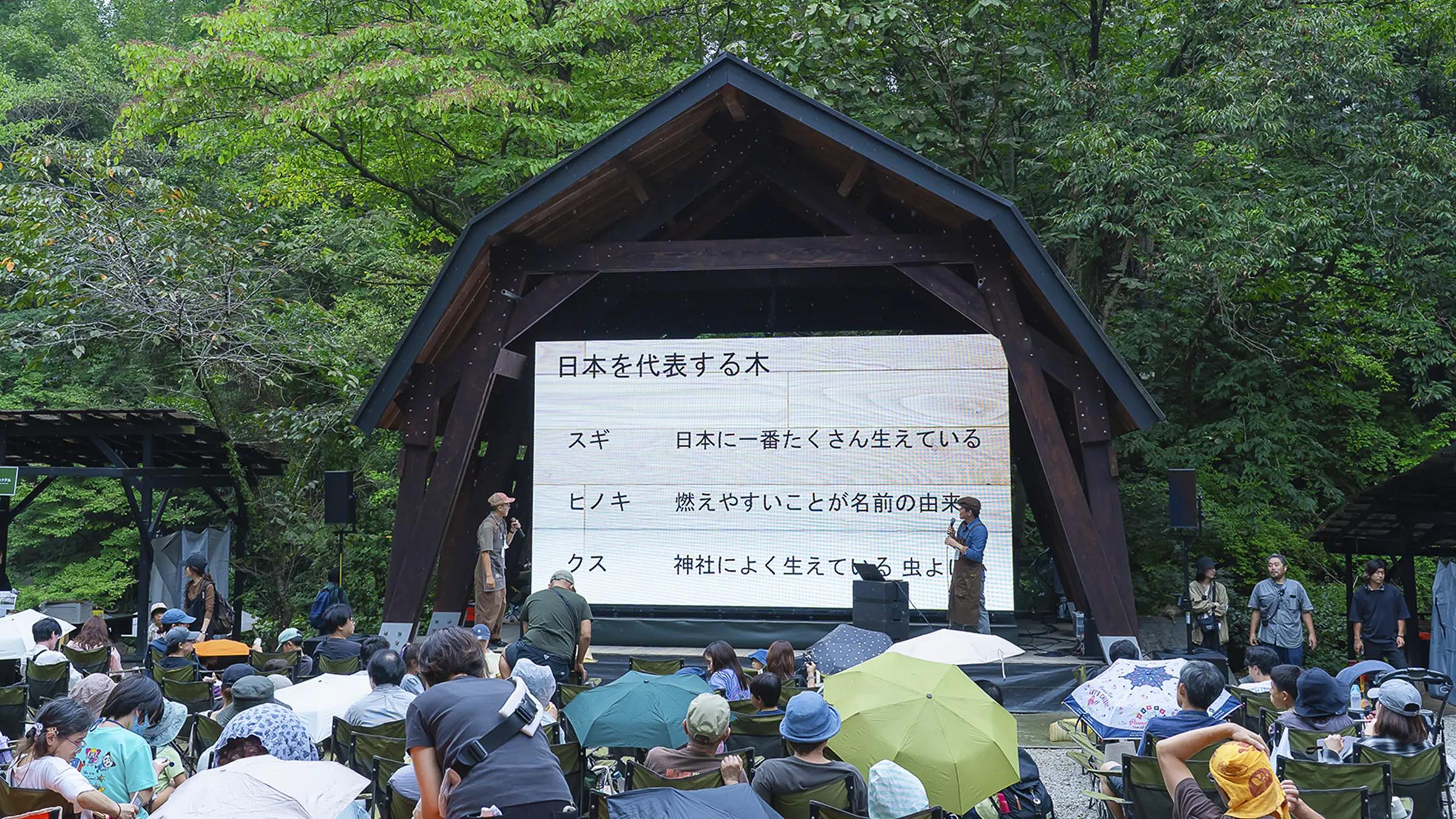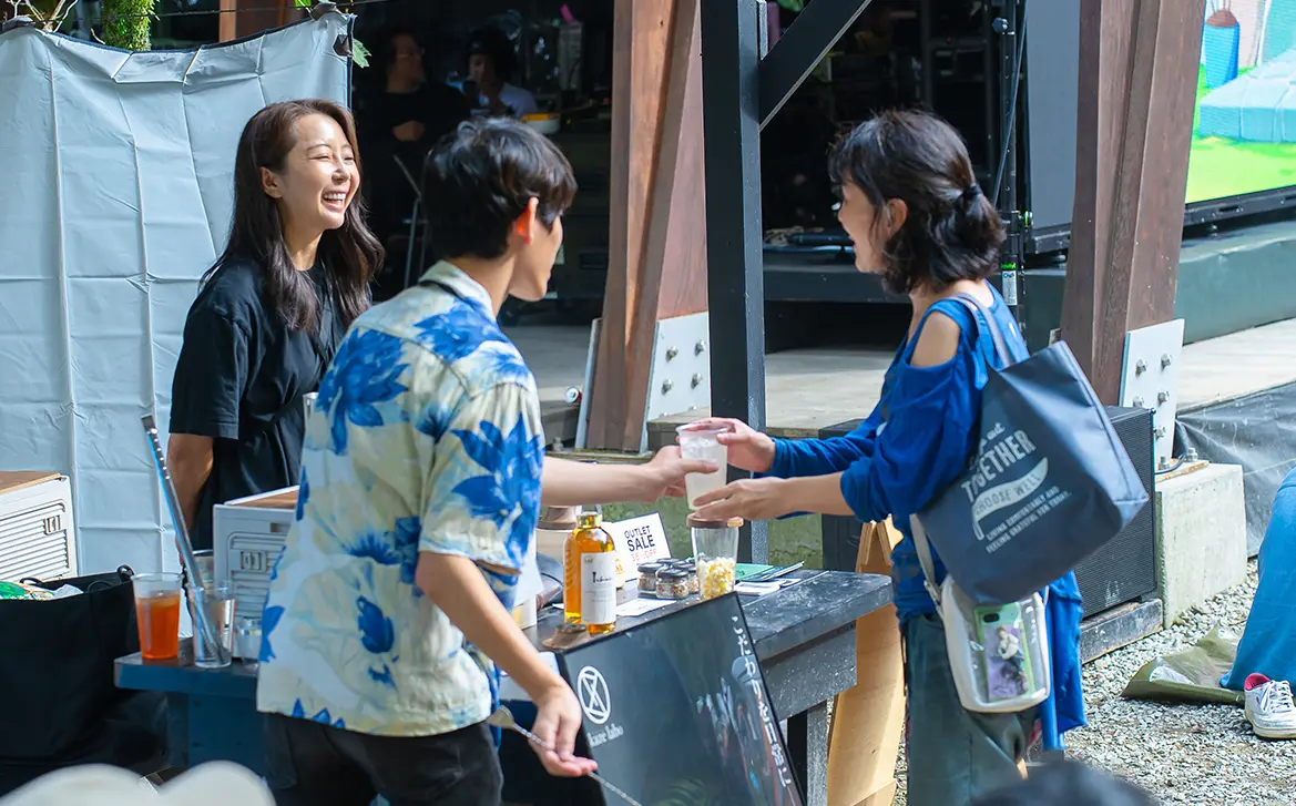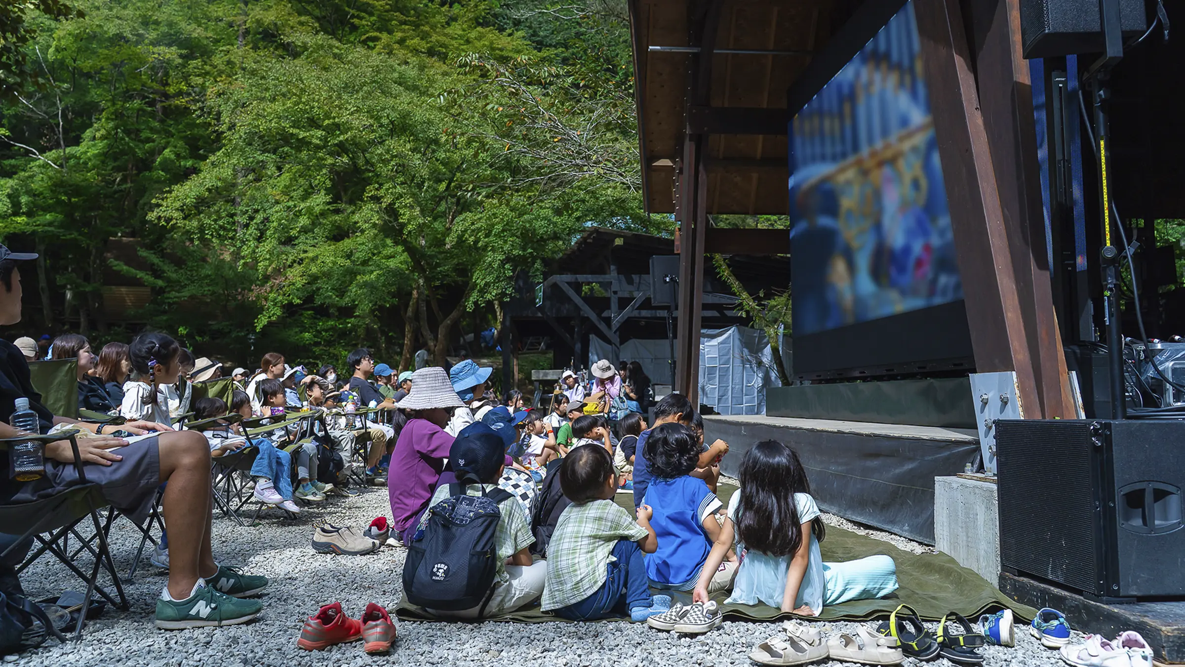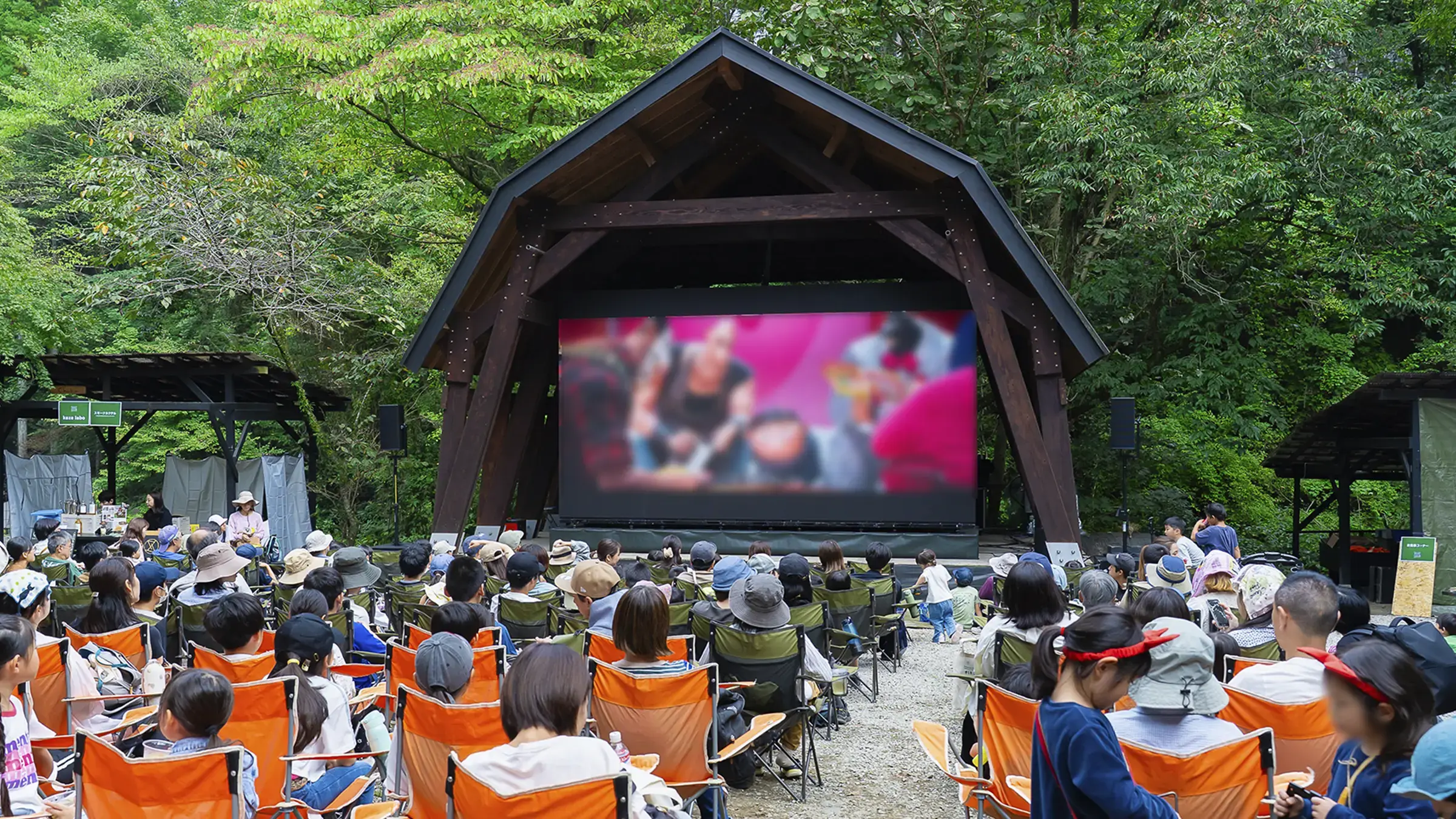 皆さんのお目当ては、やはり、青空の下での映画鑑賞。「木々に囲まれた中で映画を観るのは初めて」「子どもに貴重な体験をさせてあげたくて」などの声が来場者から多く聞かれ、ステージ上に設置した幅5.4m、高さ3mの巨大スクリーンの前に並べられたキャンプチェアはあっという間に満席になりました。「丸太アスレチック」や「薪割り」「バードコールづくり」「どんぐりパチンコ」など、とうきょうの木に触れられる体験型ワークショップはお子さま連れのファミリーに人気で、行列ができるほどの盛況ぶりとなりました。また、地元の食材を使った奥多摩産ヤマメのラーメン、東京しゃもパエリア、お好み焼きといったキッチンカーや、地元名物のあじさい茶のほか、スモークカクテルなどのドリンクも大好評。映画、食事、ワークショップ体験と、思い思いのスタイルで、森での1日を楽しんでいました。